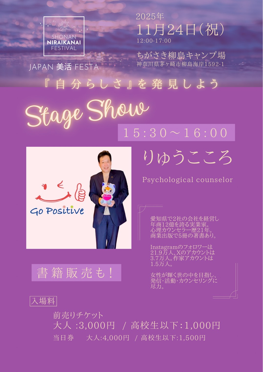 イベントに登壇します 投稿日 2025年11月11日 著者 Satomi カテゴリー お知らせ 11月24日に神奈川県のちがさき柳島キャンプ場にてりゅうこころがイベントに登壇されます 当日16時〜は、ステージにて登壇します。 参加したい方は、当ホームページのお問い合わせからご連絡ください。チケットの手配をします。
